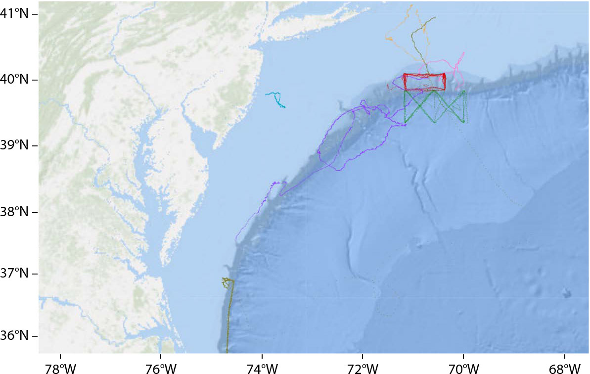 FIGURE B1-1. Results from a colocate search. Different colored lines show where available data have been found. Figure created from code available in the colocate module. > High res figure