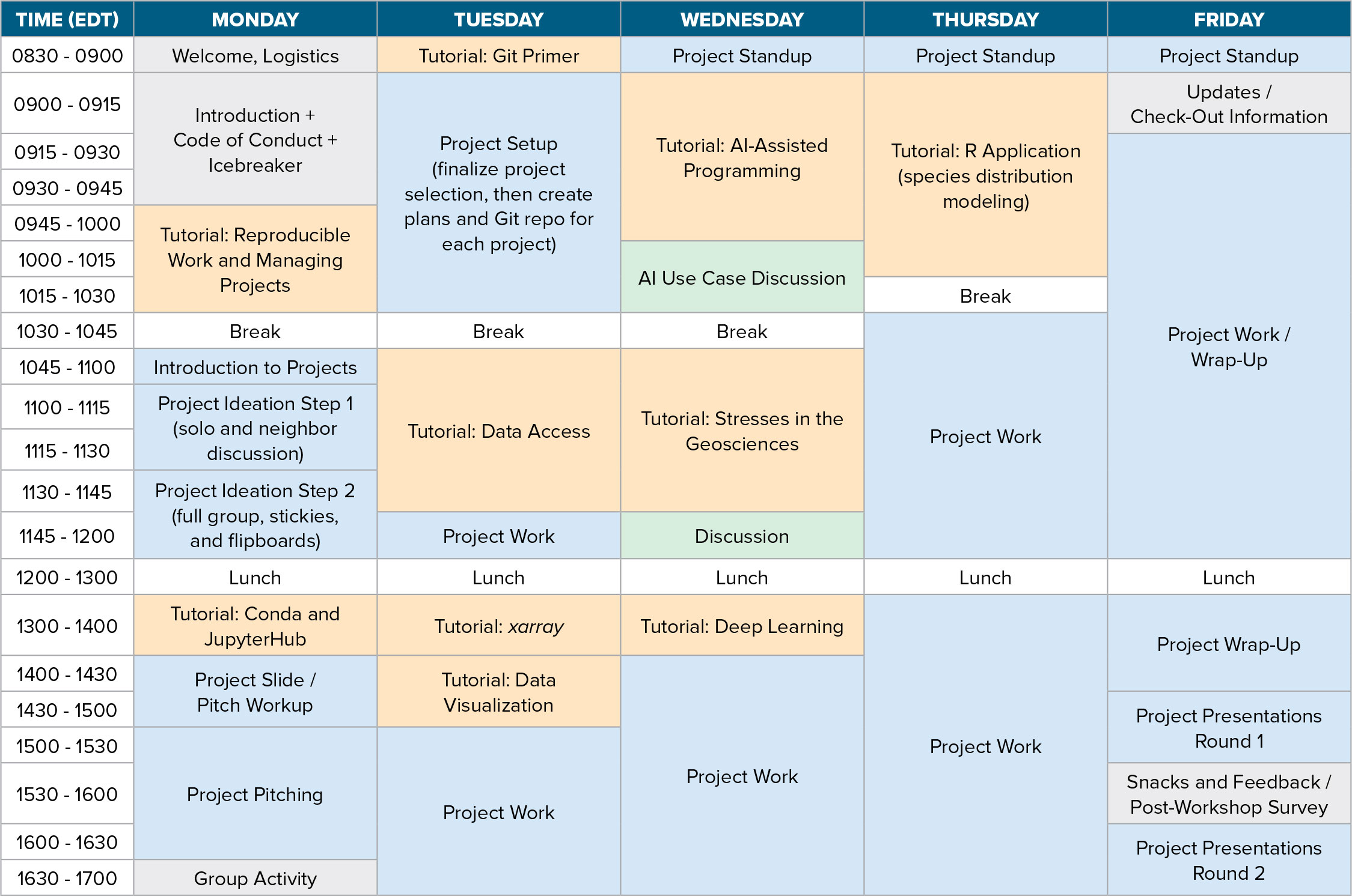 FIGURE 1. Example schedule from the 2024 OceanHackWeek workshop. General activities are in gray, tutorials are in orange, discussions are in green, and project related activities are in blue. > High res figure