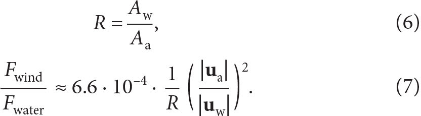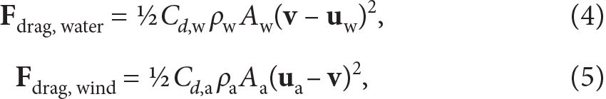 where uw and ua are the water and wind velocities, Cd is the drag coefficient, A is the effective cross-sectional area, and subscripts w and a refer to water and air, respectively.