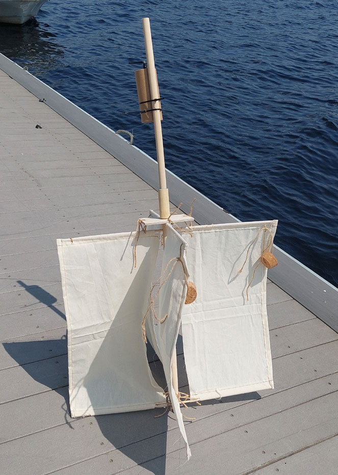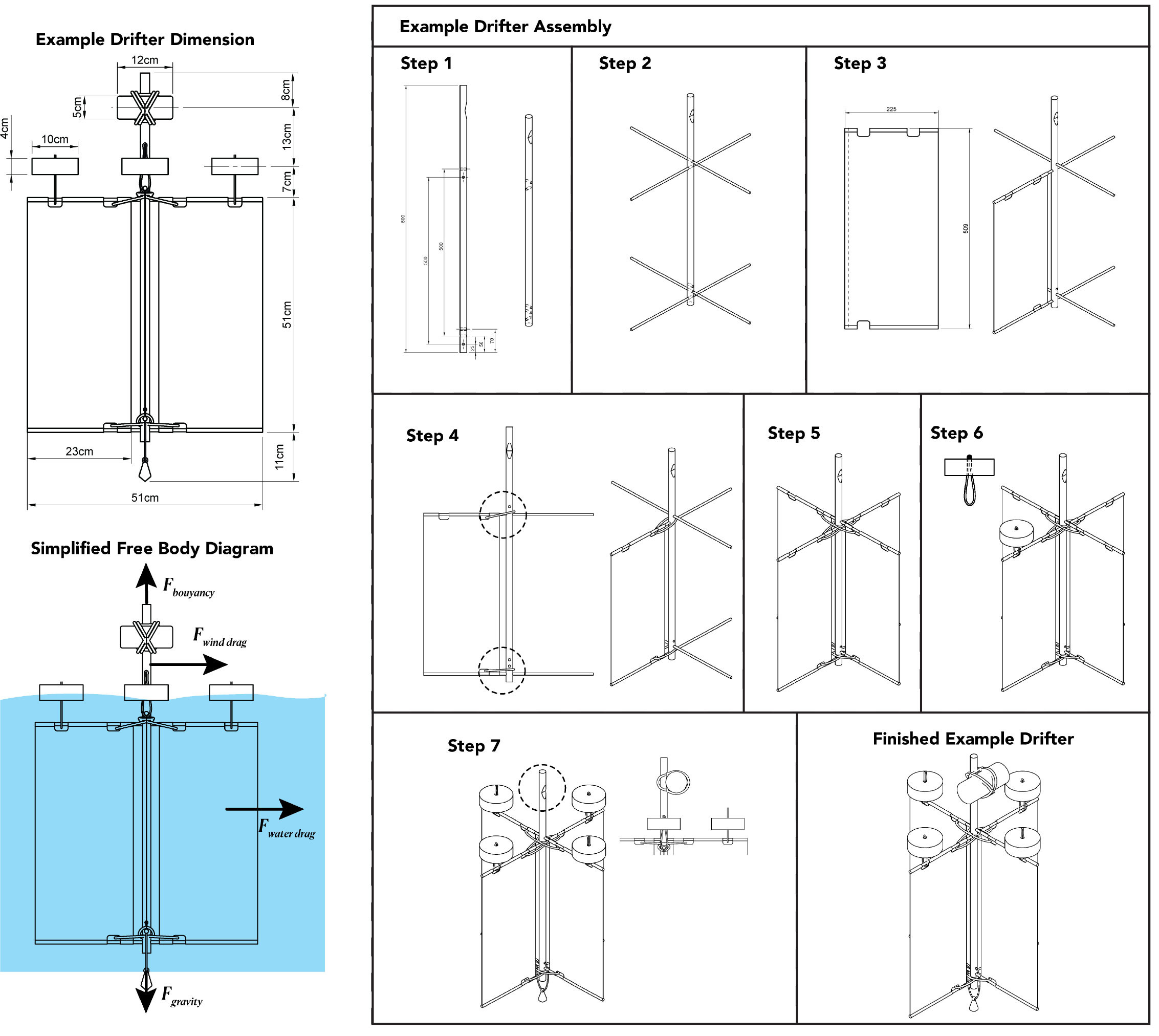 FIGURE 1. (left) Dimensions of example drifter and simplified free body diagram of the drifter. (right) Instructions for constructing the example drifter frame and drogue with provided materials. The frame and drogue were made from wooden dowels, cotton canvas, jute rope, cork for buoyancy, and fishing weights. The drogue was tensioned against the center dowel with hemp rope that was threaded through the cork float and tied to the attachment point, with grommets reinforcing the drogue attachment points. > High res figure |