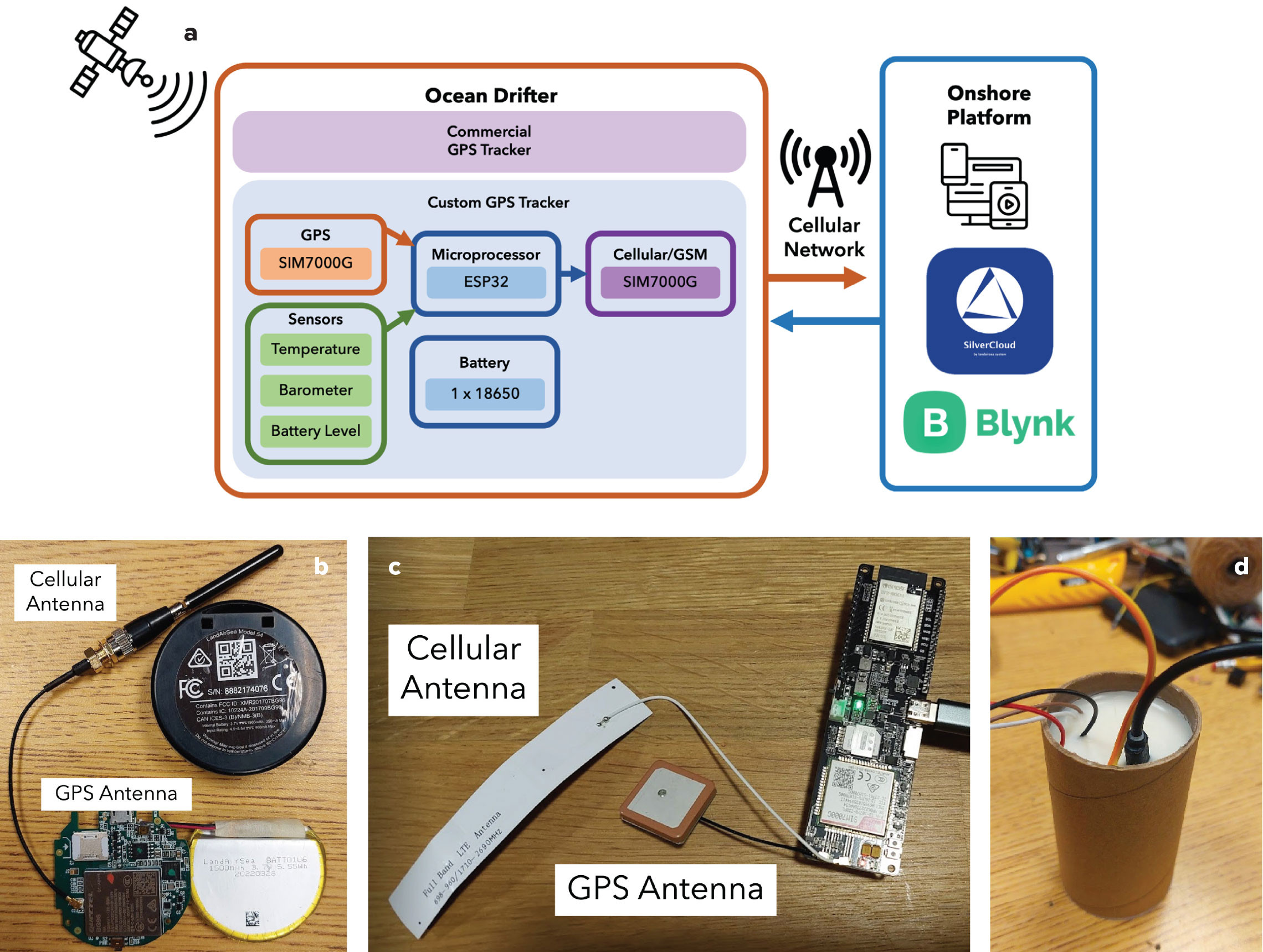 FIGURE 3. (a) Electronic system block diagram for the drifter. (b) Tear down of the commercial GPS tracker electronics component. (c) Custom GPS tracker electronics components. (d) Coconut wax potting example. The code for the custom GPS is available on Github. > High res figure |