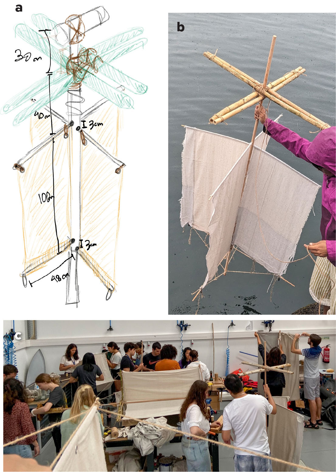 FIGURE 4. Before building began, teams worked on planning and designing the attributes of their drifters. (a) This sketch depicts an initial student drifter design employing natural, locally sourced cane found by one of the students living on Faial. (b) The corresponding drifter, built according to the sketch, is shown during the testing phase. (c) Student teams spent about 10 hours designing and building drifters over one week. Teams were given access to basic hand tools. > High res figure |