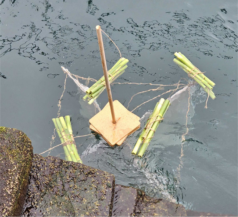 The seven teams (six student teams and one instructor team) explored various design approaches, varying the size and shape of the drogue (cross-shaped vs. square-shaped), the drogue depth (ranging from just below the surface to 15 m deep), and the placement and distribution of weights and buoyant materials. Additionally, some students incorporated store-bought coconut shells and locally sourced cane as supplementary buoyancy materials (Figure 4). During testing, they adjusted buoyancy by modifying the float and weight, checked the drifter’s ability to self-right after capsizing (Figure 5), and validated both the commercial and the custom GPS tracking systems.