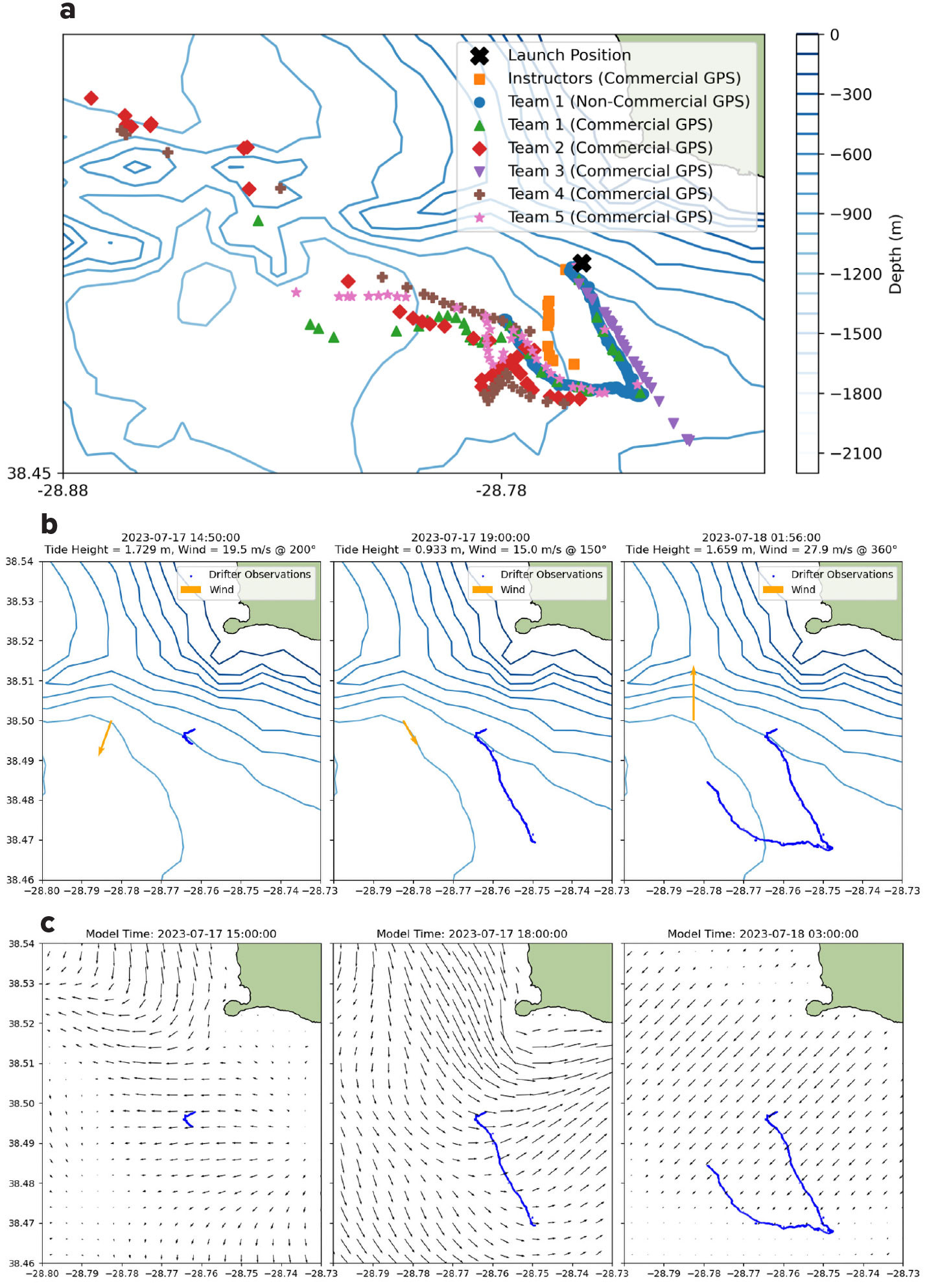 FIGURE 7. Panel (a) shows the drifter trajectories obtained from each of the individual teams. Snapshots of the observations from the non-commercial Team 1 GPS are provided at three timestamps between July 17, 2023, and July 18, 2023. In panel (b), the orange arrow shows the speed and direction of the wind at that instant as measured by a nearby weather station, and the blue contour lines represent the bathymetry. The tide height is listed in the header. In panel (c), the arrows represent the surface velocity field that was determined by the numerical simulation, but the temporal resolution of the model is three hours, so the snapshots do not capture the full dynamics of the drifter. Watch the animations of panels b and c in the flipbook version of this article. > High res figure |
