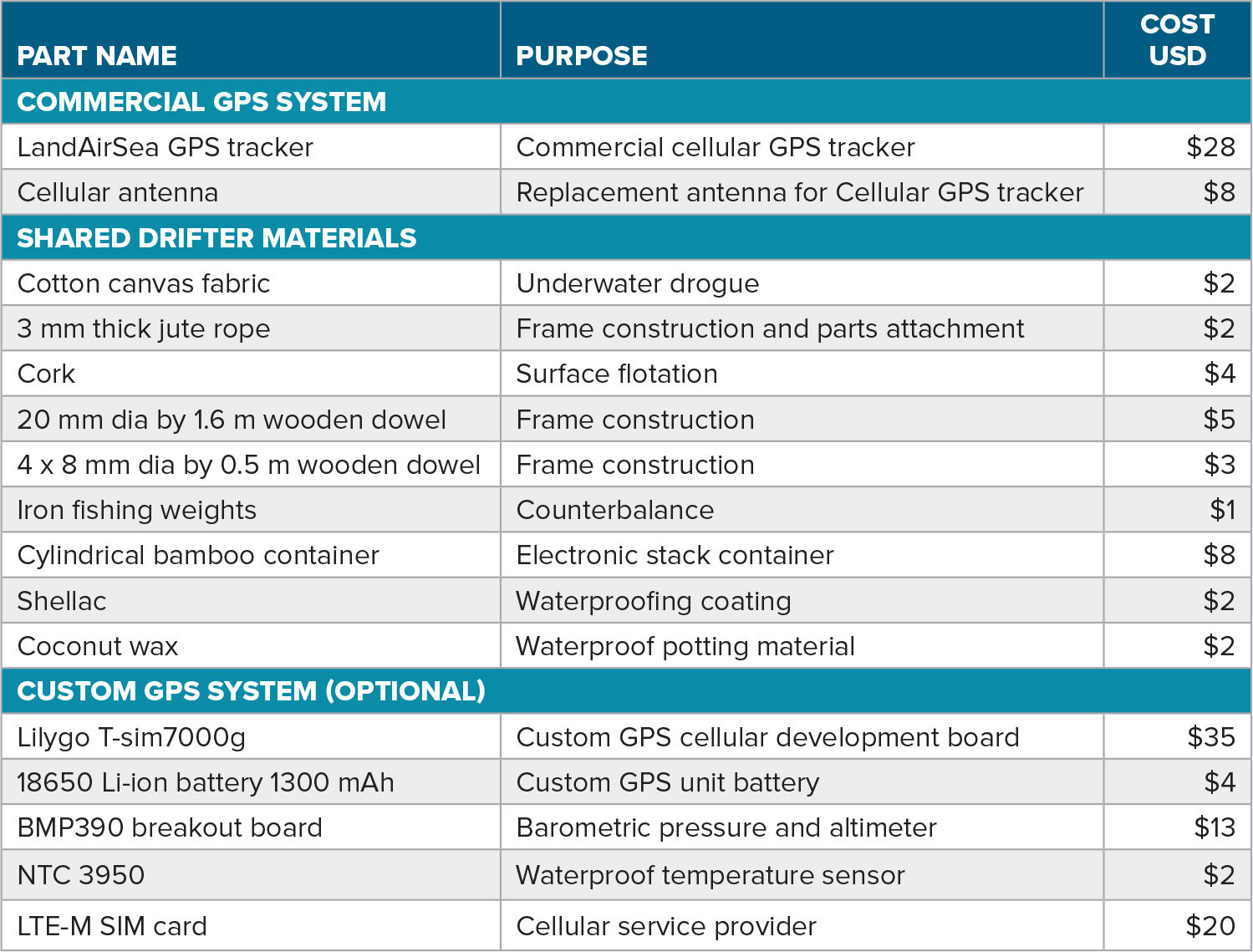 In our program, each team was supplied the materials needed (Table 1), though they were permitted to use locally available alternatives. Because the drifters were not intended to be retrieved, all components except the electronic stack were biodegradable. During the design phase, students were encouraged to think about drogue geometry, length, and weight distribution. They received instructions in the form of a presentation, which, along with written instructions and code, is available in the project’s GitHub repository.