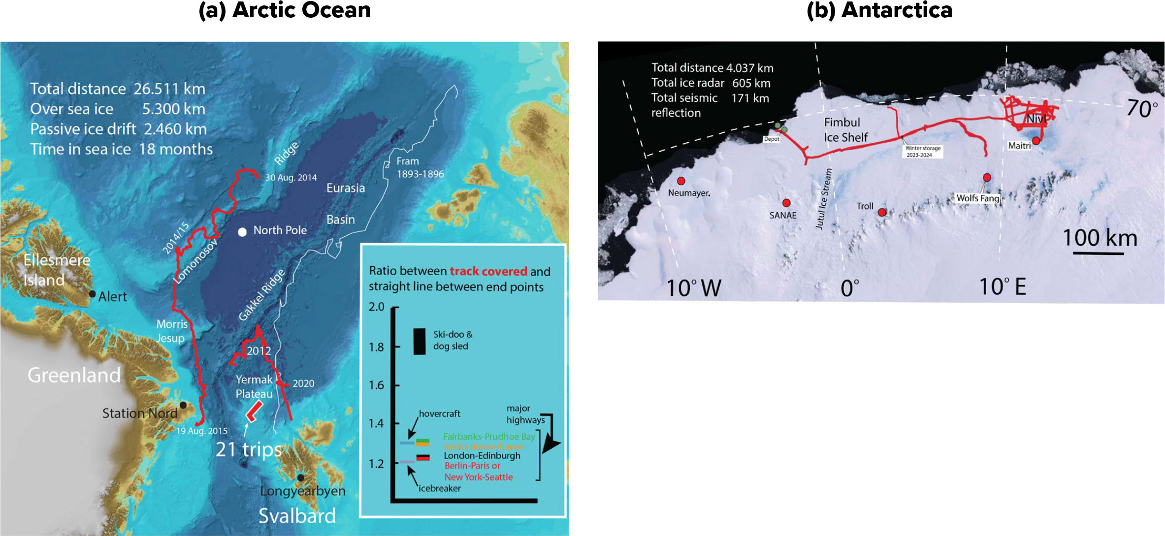 FIGURE 3. Overview of the hovercraft operations (red track lines) described (a) in the Arctic Ocean and (b) in Antarctica. The inset shows a comparison of the efficiency of travel. Numbers for the track covered relative to the great circle distance for the hovercraft and the icebreaker are for travel between the ice edge and 85°N along 17°E in the Transpolar Drift. Numbers for Ski-Doo and dog sled include travel in both the Beaufort Gyre and the Transpolar Drift (Kristoffersen and Hall, 2014). Watch the accompanying videos in the flipbook version of this article. > High res figure