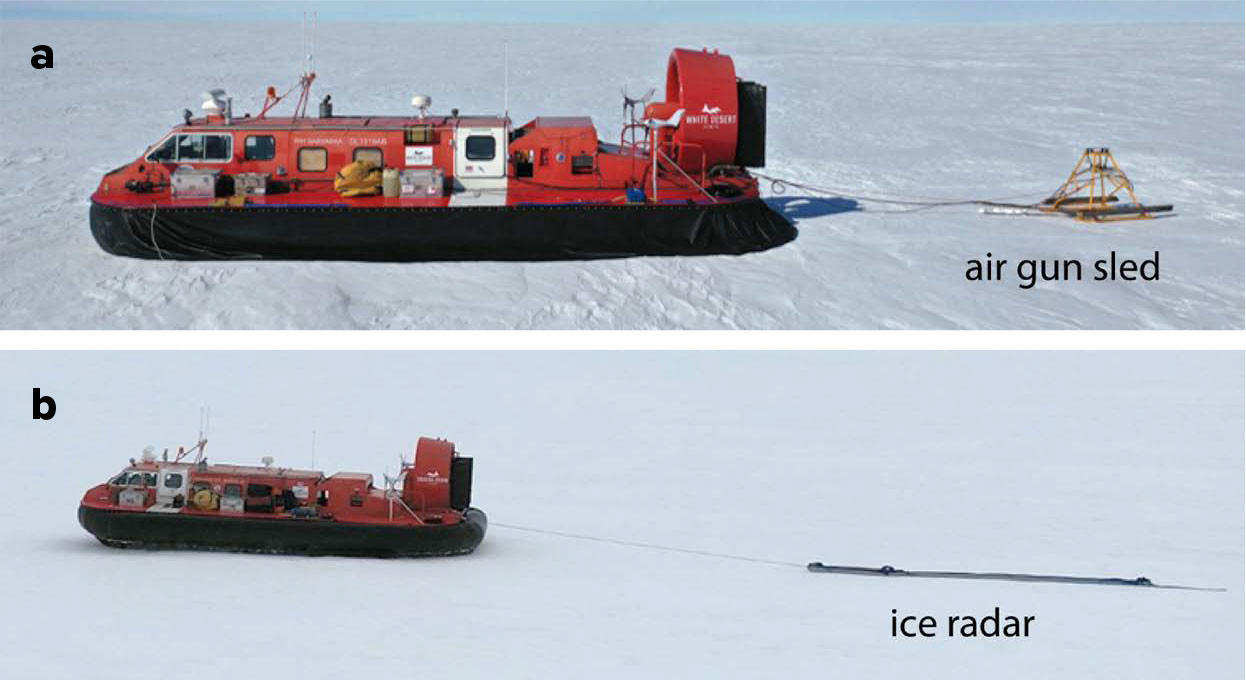 FIGURE 6. Sabvabaa tows an air gun sled for (a) seismic reflection measurements, and (b) ice radar during a survey of the Nivl Ice Shelf in Antarctica in December 2024. See Figure 3b for location. > High res figure