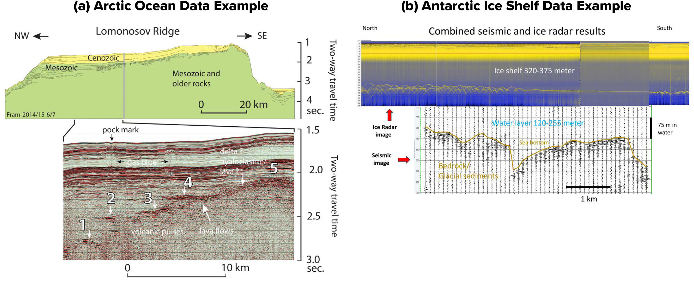 FIGURE 7. (a) Seismic reflection section across the Lomonosov Ridge (87°N) acquired during January 2015. The top section is a line drawing of the full profile, with an expanded view of the seismic reflection data within a 20 km interval of special interest below it. This seismic section documents the first evidence of Mesozoic volcanic pulses (numbered) on the Lomonosov Ridge (from Kristoffersen et al., 2023). (b) Seismic reflection (2 km/hr) results and ice radar measurements (15 km/hr) shown here were recorded on the ice shelf in Dronning Maud Land, Antarctica, using the hovercraft platform. These data demonstrate an efficient survey approach for obtaining information about seabed topography and water layer and ice shelf thickness. > High res figure