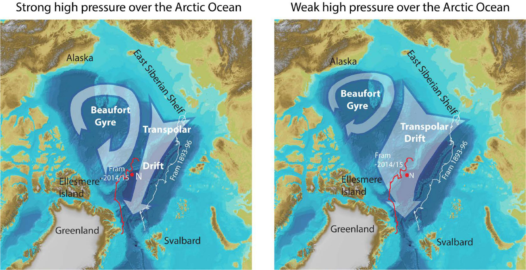 FIGURE 8. The large-scale pattern of sea ice drift in the Arctic Ocean in relation to the predominant surface air pressure (after Rigor et al., 2004). Traveling low pressures further modulate the air pressure field to induce temporary local ice drift excursions. The 1893–1896 drift of Fram is shown by the white track, and the red track follows the 2014–2015 drift of the hovercraft Sabvabaa. > High res figure
