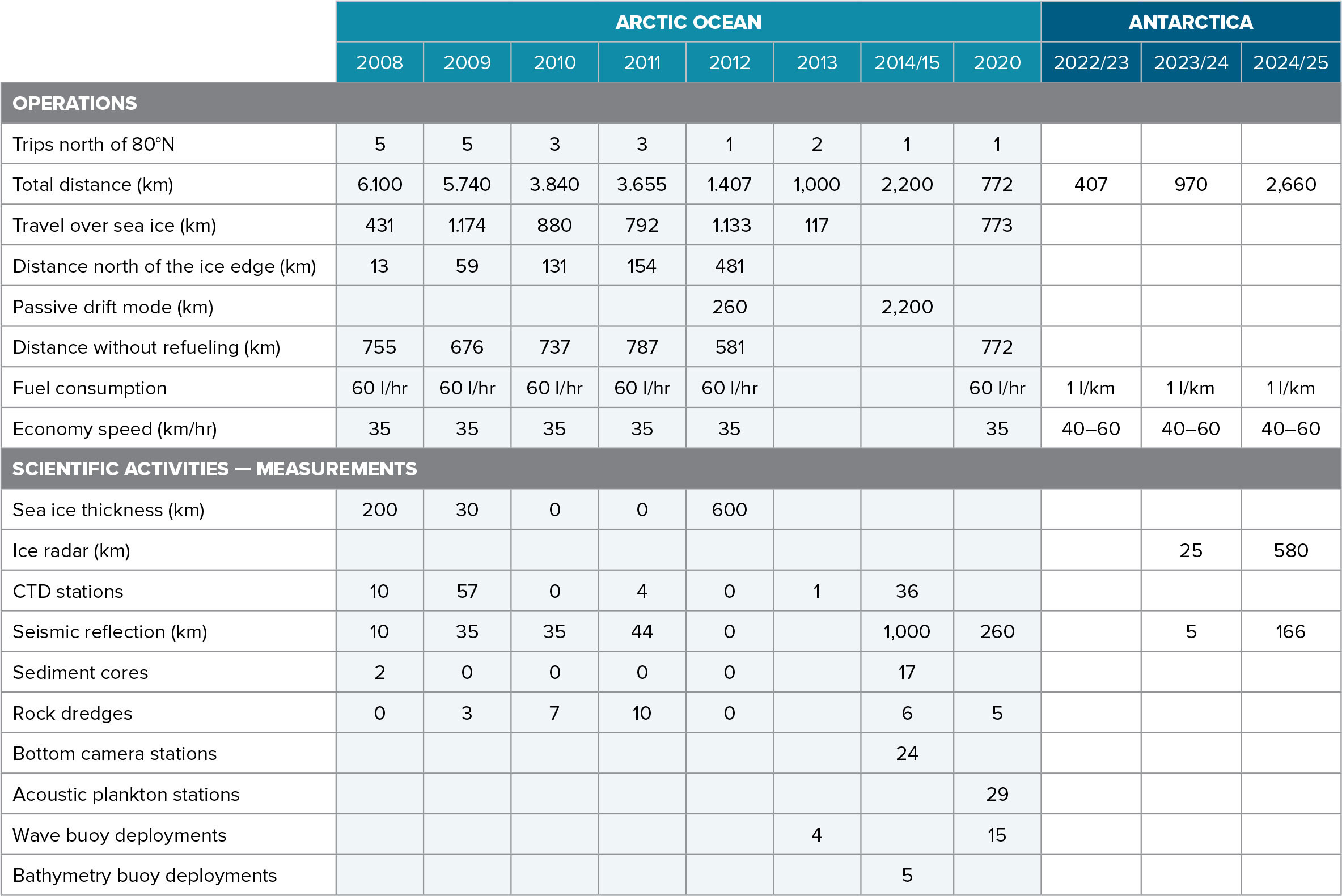 Scientific trips normally carried up to 1,600 liters of diesel fuel in auxiliary deck tanks in addition to the regular fuel capacity of 900 liters, providing a total endurance of up to 40 hours at cruise speed. This amount of fuel is sufficient for zig-zag travel in the sea ice within the Transpolar Drift for a distance of about 500 km measured along a great circle end-to-end (half-way to the North Pole measured from Svalbard). Anything more ambitious requires cooperation with an icebreaker expedition for fuel resupply. In ice drift mode over a 12-month period with limited local driving, the Fram-2014/15 ice drift expedition consumed 15 tons of diesel drawn from supplies stored on the ice at the time of deployment. The amount of fuel needed for heating was about 10 liters/day. The endurance over ice shelves in Antarctica could be well over 1,000 km for a payload of about 1 ton (personnel and scientific equipment).