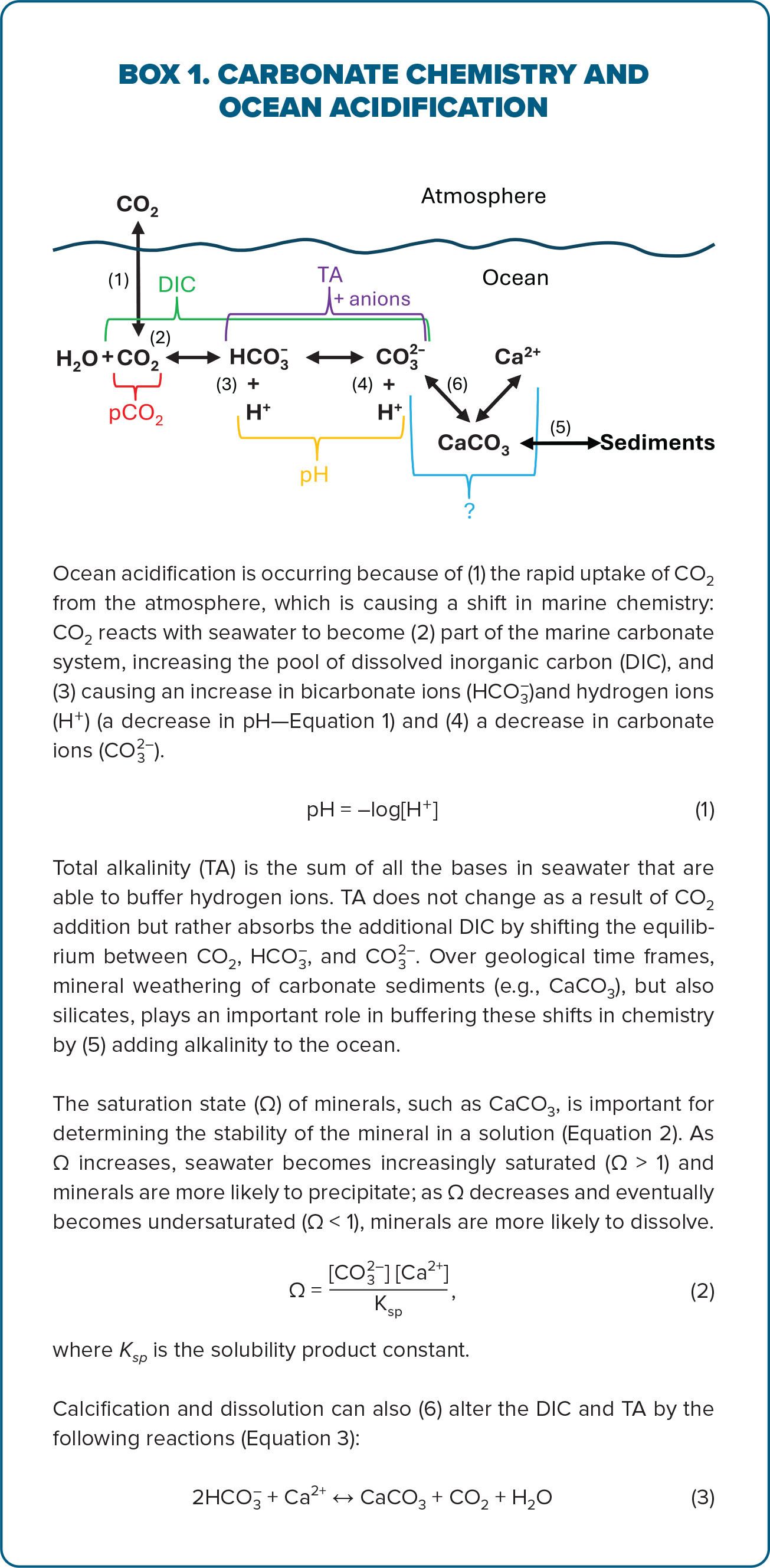 Due to human activity, carbon dioxide (CO2) concentrations in the atmosphere continue to rise. The ocean is absorbing about 30% of the extra CO2 and at present continues to store carbon (Friedlingstein et al., 2024). Because the rate of CO2 uptake into the ocean is too fast for natural geological buffering processes to keep pace, the excess carbon alters the marine carbonate system and results in a measurable decrease in ocean pH, commonly referred to as ocean acidification (OA; see Box 1; Caldiera and Wickett, 2003). The changing chemistry is impacting important biological and biogeochemical processes that rely on stable pH or specific saturation state levels of important minerals such as aragonite or calcite (Kroeker et al., 2013). These impacts have knock-on consequences for the ecosystem and the services they provide (Hall-Spencer and Harvey, 2019).