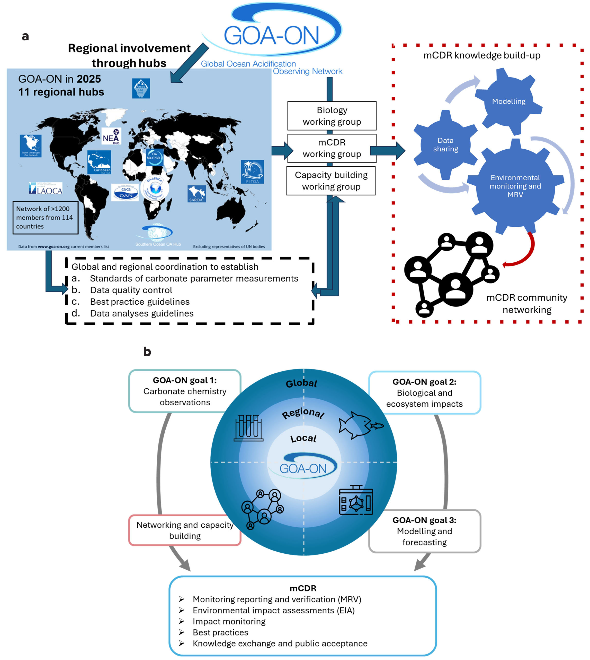 FIGURE 1. Schematics showing the integration of marine carbon dioxide removal (mCDR) activities within the Global Ocean Acidification Observing Network (GOA-ON) demonstrate (a) coordination and mechanism of knowledge exchange, and (b) how GOA-ON goals and network can support mCDR activities. > High res figure