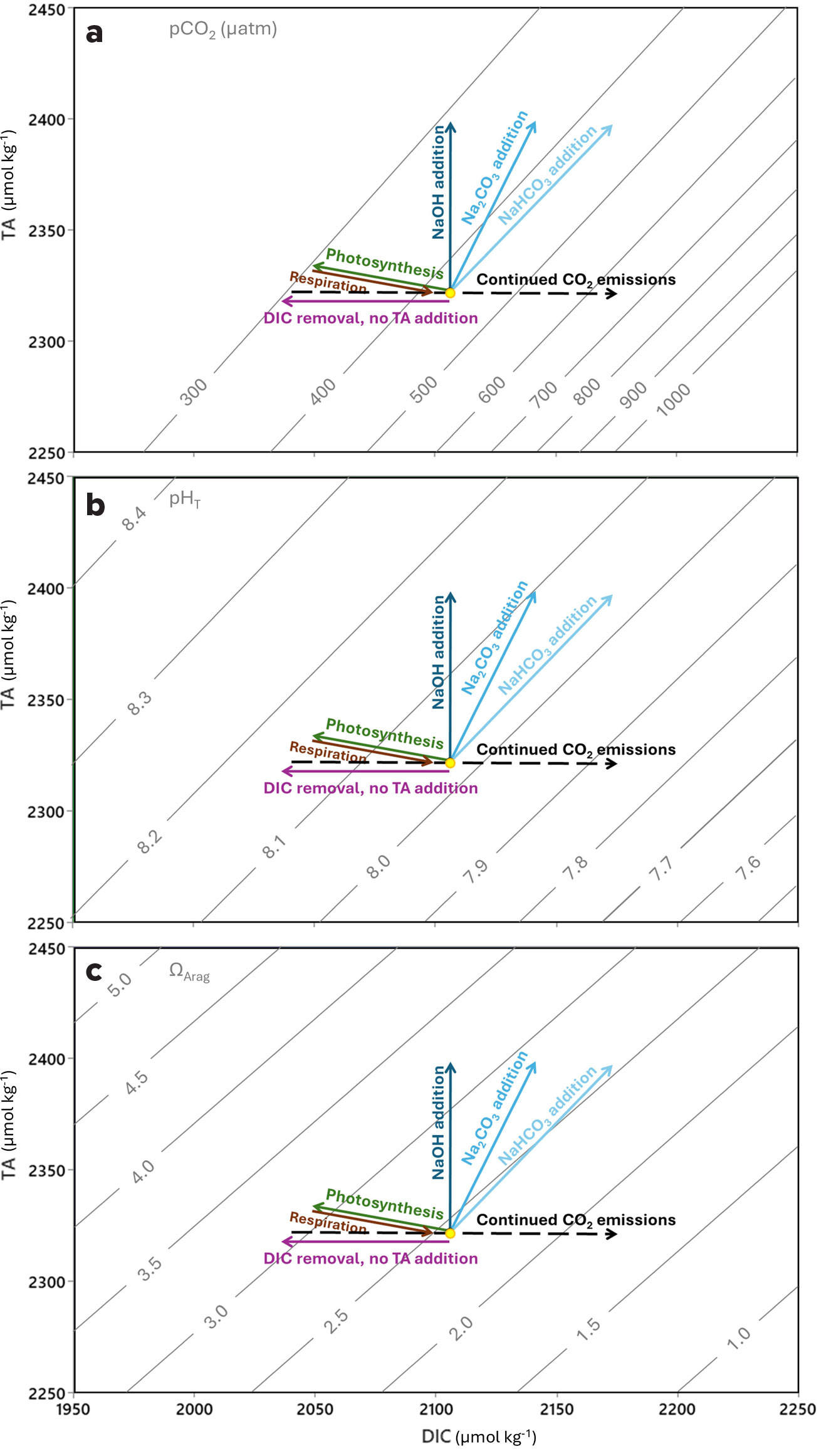 FIGURE 2. Dissolved inorganic carbon (DIC)–Total alkalinity (TA) plots showing (a) pCO2, (b) pH, and (c) aragonite saturation state. [Overlaid trajectories indicate when different mCDR approaches are applied in their unequilibrated phase] [Overlaid trajectories indicate effects of applying different mCDR approaches in their unequilibrated phases?]. The relative concentrations of these variables apply only to a specific temperature and salinity (here T = 15°C, S = 34); the absolute values will change at other combinations of temperature (T), salinity (S), dissolved inorganic carbon (DIC), and TA. In this example, present day is represented with a pCO2 of 420 μatm and shown as the yellow dot in each panel. At some point along the “continued CO2 emissions” trajectory, the mCDR approaches are applied, noting that the closer to present day CO2 levels they are applied, the less mCDR will be needed to return to present day or historic levels, and that without continued emissions reductions no mCDR approach will work. The mCDR approaches include: “DIC removal, no TA addition” (purple), which represents direct ocean carbon capture and storage (DOCCS); three ocean alkalinity enhancement (OAE) options as represented in Schulz et al. (2023): “NaOH addition” (dark blue), which adds TA and not DIC; “Na2CO3 addition” (mid blue), which adds TA and half as much DIC; “NaHCO3 addition” (light blue), which adds equal amounts of TA and DIC; “Photosynthesis” (green), which is all photosynthetically driven mCDR (e.g., macroalgae growth, nutrient fertilization, artificial upwelling; these may have additional impacts on alkalinity depending on the form of nutrient additions and the type of photosynthetic organism). Also shown is “Respiration” (brown), representing eventual remineralization of organic matter. Here, photosynthesis and respiration are assumed to occur as a result of nitrate or nitrite being the N source and product, respectively (as opposed to ammonia). See Wolf-Gladrow and Klaas (2024). > High res figure