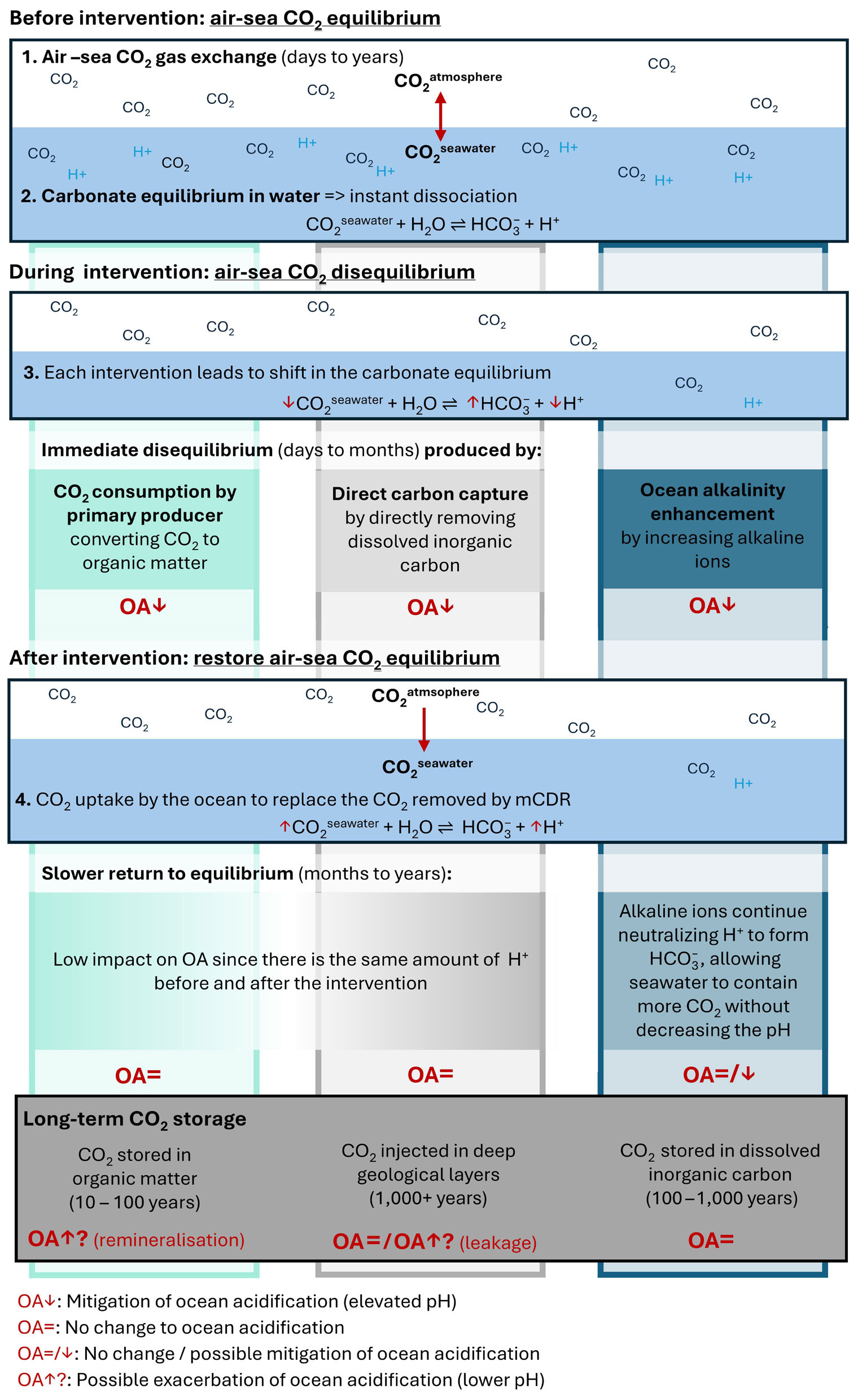 FIGURE 3. Schematic of the air-sea equilibrium and carbonate chemistry of seawater before, during, and after mCDR interventions, highlighting potential connections to ocean acidification (OA) as indicated by the dark red annotations. “OA↓” indicates mitigation of OA (elevated pH), “OA =” indicates no change in OA, “OA=/↓” indicates no change/possible mitigation of OA (elevating pH), and “OA↓?” indicates possible exacerbation of OA (lower pH). For the biological mCDR column, long-term storage is dependent on the vertical partitioning of the biological carbon pump, and where the organic matter finally ends up. It is highly likely that the organic matter remineralizes back to CO2 in the deep ocean, then potentially exacerbates OA. For the other two columns, long-term storage is likely to be stable in DIC form (OAE) or in geological storage (DOCCS), where there is low likelihood of leakage back into the marine system as CO2 (which could then exacerbate OA). > High res figure
