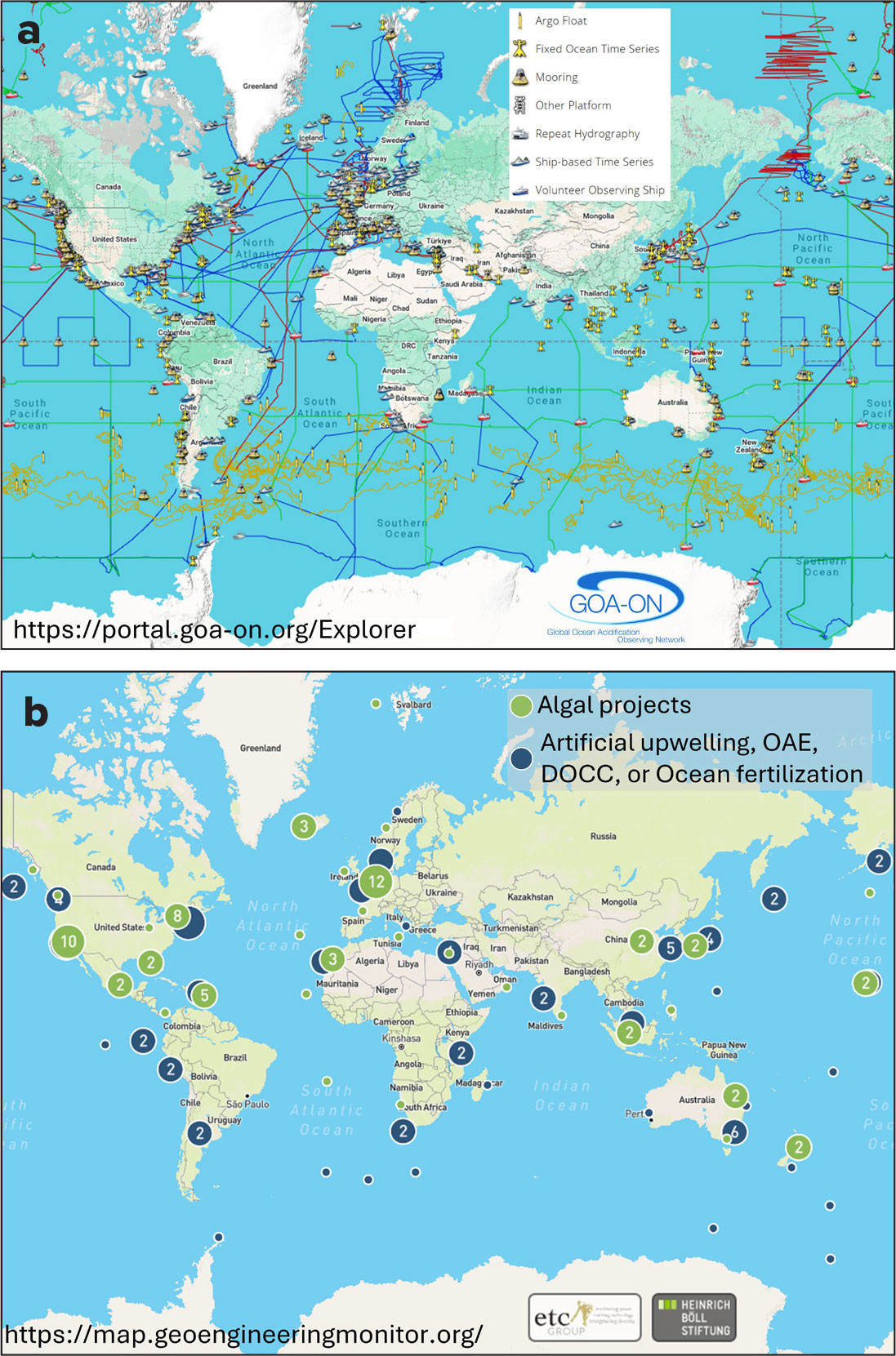 FIGURE 4. Maps show (a) OA-relevant monitoring, taken from the GOA-ON Data Explorer (correct as of January 2025), and (b) mCDR activities between 2000 and 2025 (numbers in circles indicate number of projects in that area), taken from the Geoengineering Map (correct as of January 2025). > High res figure
