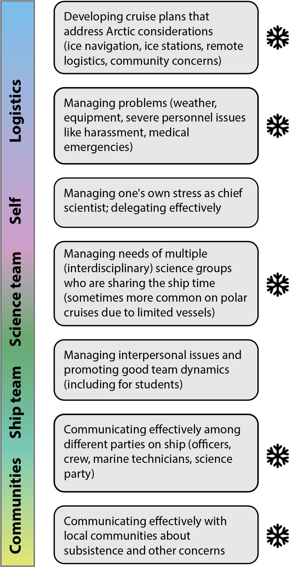 Polar research vessels are a critical link in Arctic science capacity. However, using them to accomplish timely, high-quality research requires scientists to serve in leadership positions in order to effectively plan and organize surveys, manage mobilization of equipment and personnel, communicate well with captains and crew, and build positive community relations. Chief scientists can also find themselves needing to navigate and mediate interpersonal dynamics among team members as well as complex dynamics among the science community, agencies, communities, and international parties.