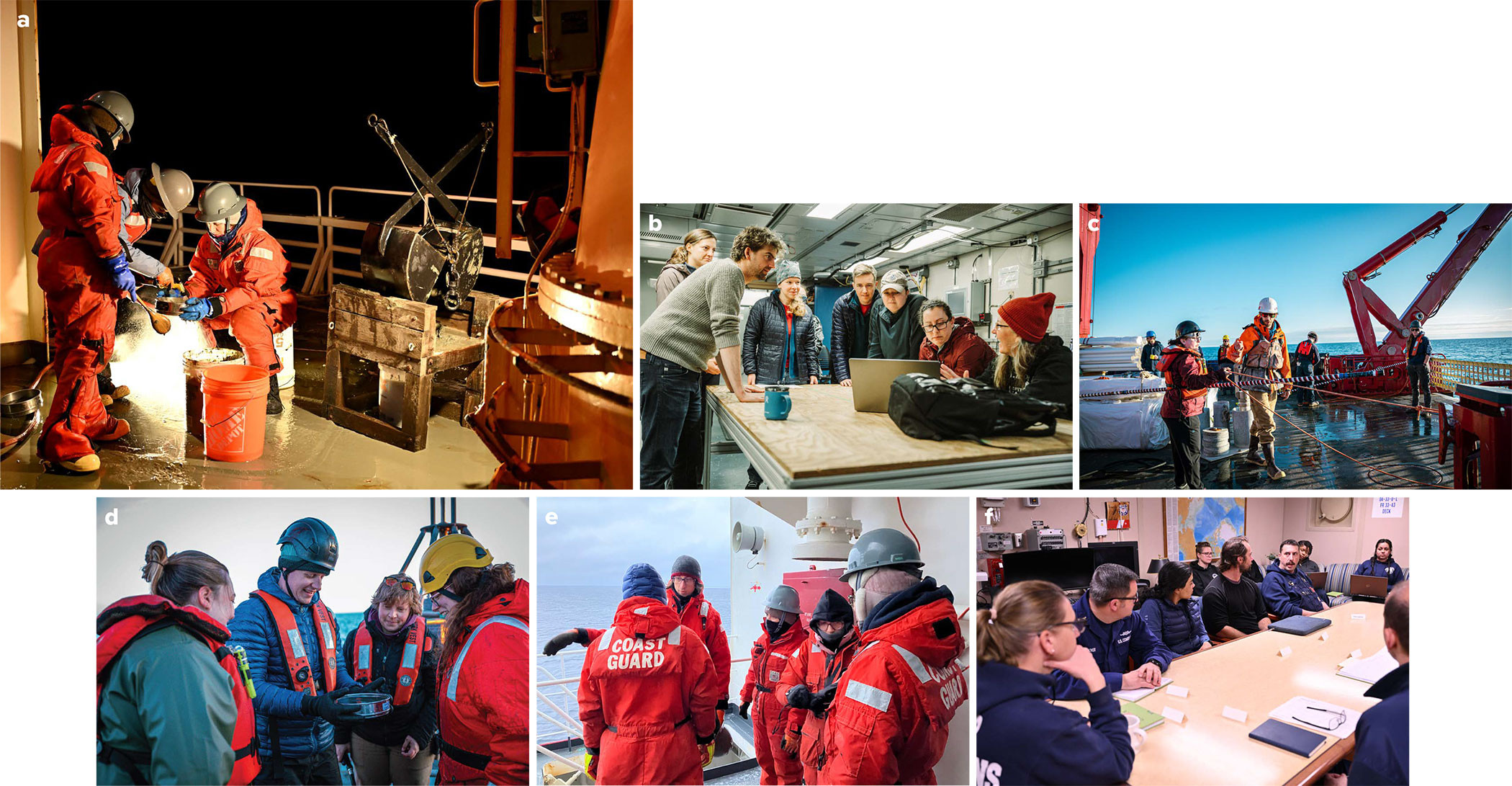 FIGURE 2. Examples of participant engagement from both cruises. (a) A physical oceanographer and a remote sensing specialist assist a benthic ecologist with sample processing. (b) Participants work to develop their science plan for the next few days. (c) A marine technician and a participant recover a multicore. (d) A participant studying clams shares knowledge with paleoceanographers. (e) Participants confer to coordinate small-boat deployments. (f) Two participants (center) join the daily captain’s briefing on USCGC Healy. Photo credits: (a,f) Matthew Masaschi, USCG, (b–d) Lloyd Pikok Jr., UIC Science/Battelle, (e) Emily Eidam. > High res figure