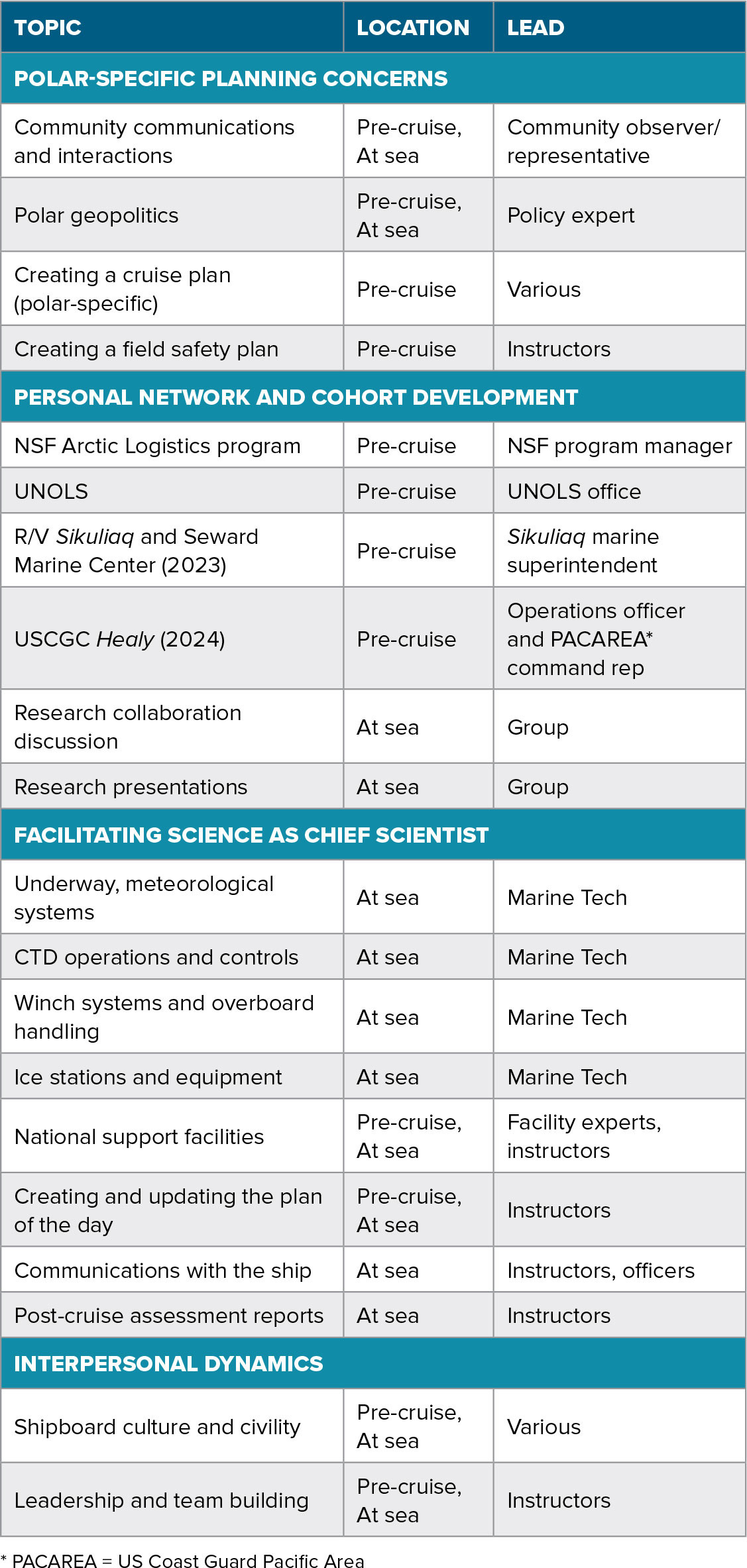 This work was funded by NSF grants OPP 2303606 and 2401176. We thank the captains, crew, marine technicians, and community observers on R/V Sikuliaq (2023) and USCGC Healy (2024) for their support of these training efforts, with special acknowledgment to CAPT J. Hamill on Sikuliaq and CAPT M. Schallip, LCDR A. Hamel, and ENS. K. Gower on Healy. Marine technicians Ethan Roth, Emily Shimada, Brandon D’Andrea, and Chris Fanshier contributed substantially to the success of this program by sharing their time and expertise at sea. We thank all the guest presenters and mentors who participated in the workshops and at sea. We thank the Hamlet of Kugluktuk in Nunavut, Canada, for their generosity in accommodating a planned personnel transfer and supporting a community event in summer 2024. Finally, we thank the 34 participants who brought their energy and ideas to the program and developed robust collaborative relationships.