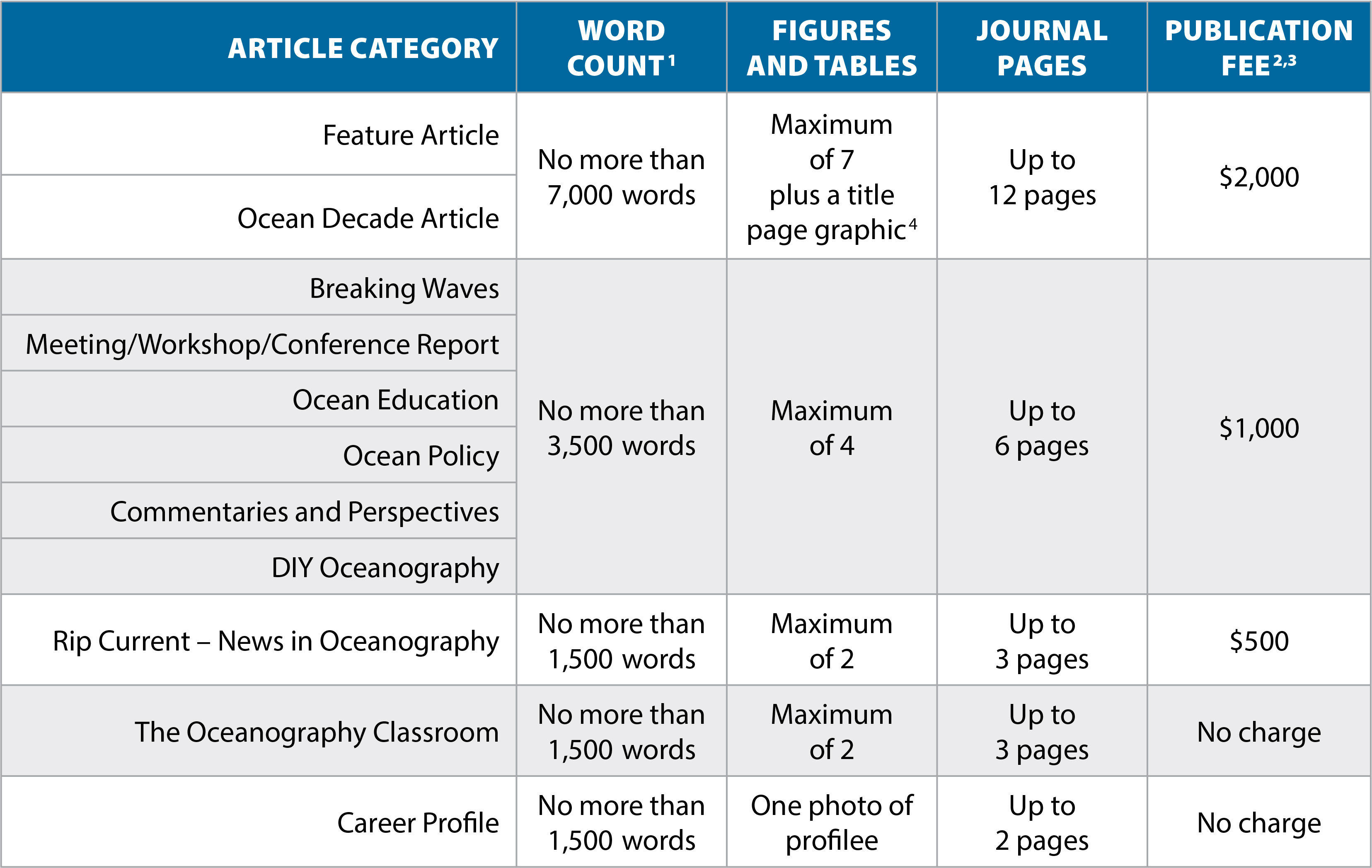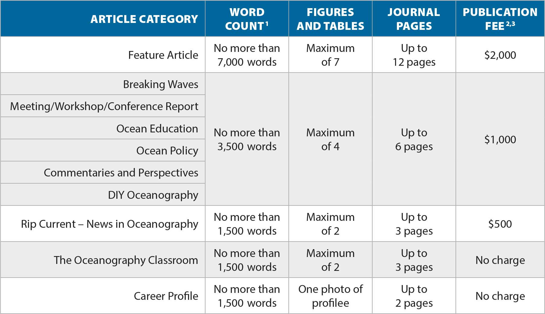 PUBLICATION FEE. The fee for publishing Feature Articles that are not part of invited special issue sections is $2,000. The publication fee for Breaking Waves, Meeting Reports, Commentaries, Perspectives, Ocean Education, and Ocean Policy articles of up to six magazine pages in length is $1,000. The publication fee for short Rip Current news articles is $500. There is no charge for invited book reviews and The Oceanography Classroom columns. Payment information (credit card number or purchase order number) must be provided at the time a proof of the manuscript is distributed to the corresponding author. Authors can request a waiver from TOS (email to [email protected]) for all or part of the publication fee if they document their inability to cover the expense.