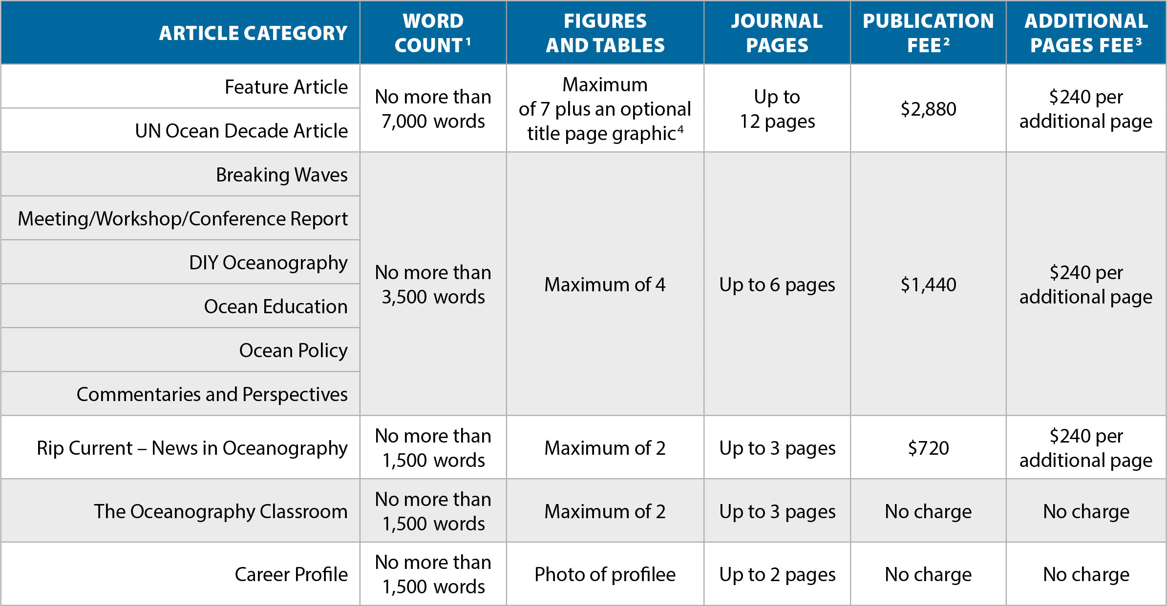 2 Authors can request a waiver from The Oceanography Society (email to [email protected]) for all or part of the publication fee if they document their inability to cover the expense. 3 If an article exceeds the journal page count specified for its category, a charge of $240 per page will be assessed for each additional page. 4 If relevant, include a high resolution graphic for the title page of the article—preferably a high-resolution photo of related fieldwork or a visual abstract (a concise, graphical representation of the key findings). |
